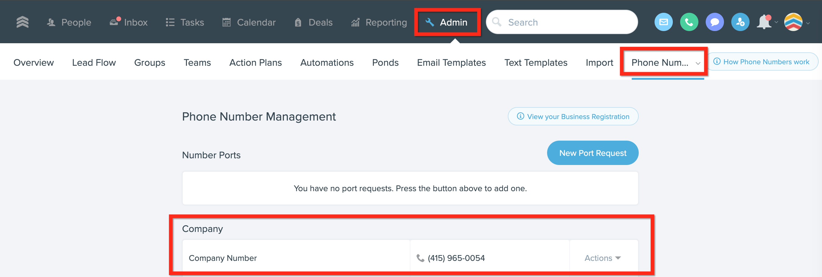 Admin users can view the Company Number by going to Admin > Phone Numbers.