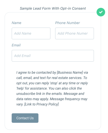 "I agree to be contacted by [Business Name] via call, email, and text for real estate services. To opt out, you can reply 'stop' at any time or reply 'help' for assistance. You can also click the unsubscribe link in the emails. Message and data rates may apply. Message frequency may vary. [Link to Privacy Policy]."