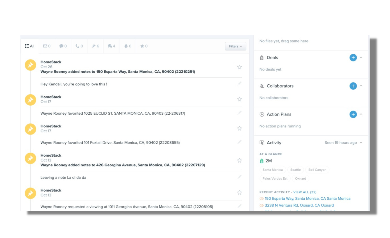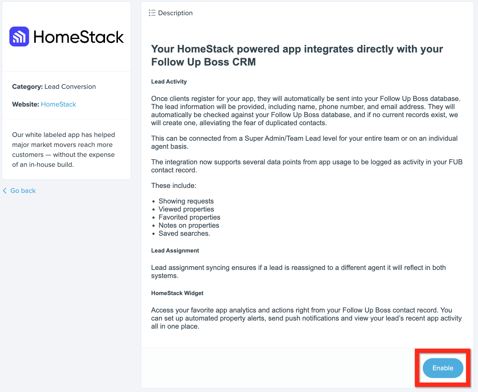 In addition to contact details, HomeStack can log in-app activity directly to the Follow Up Boss contact record.