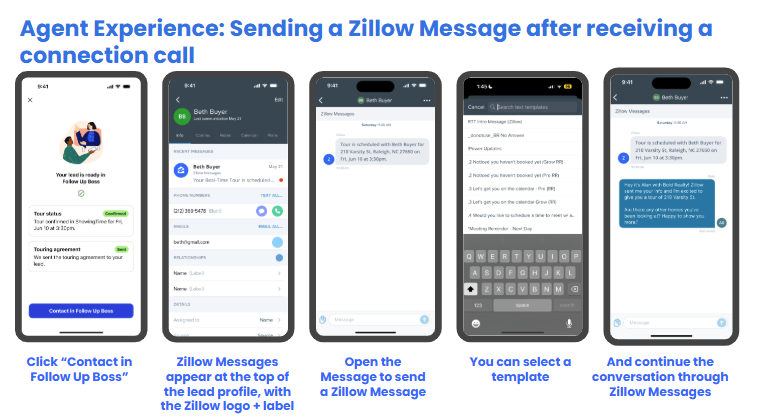After receiving a Zillow connection (from tour requests or property inquiries), you will be able to send a Zillow Message once your appointment has been confirmed by clicking on “Contact in Follow Up Boss” (screen 1), which opens that contact’s page on the FUB mobile app.