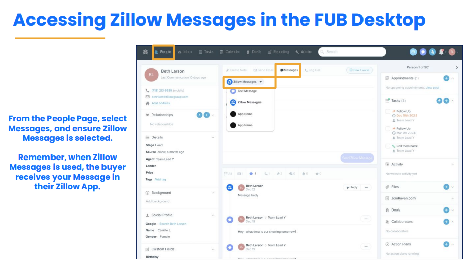 For more information about how to use Zillow Messages in FUB, take this short Zillow Academy course.