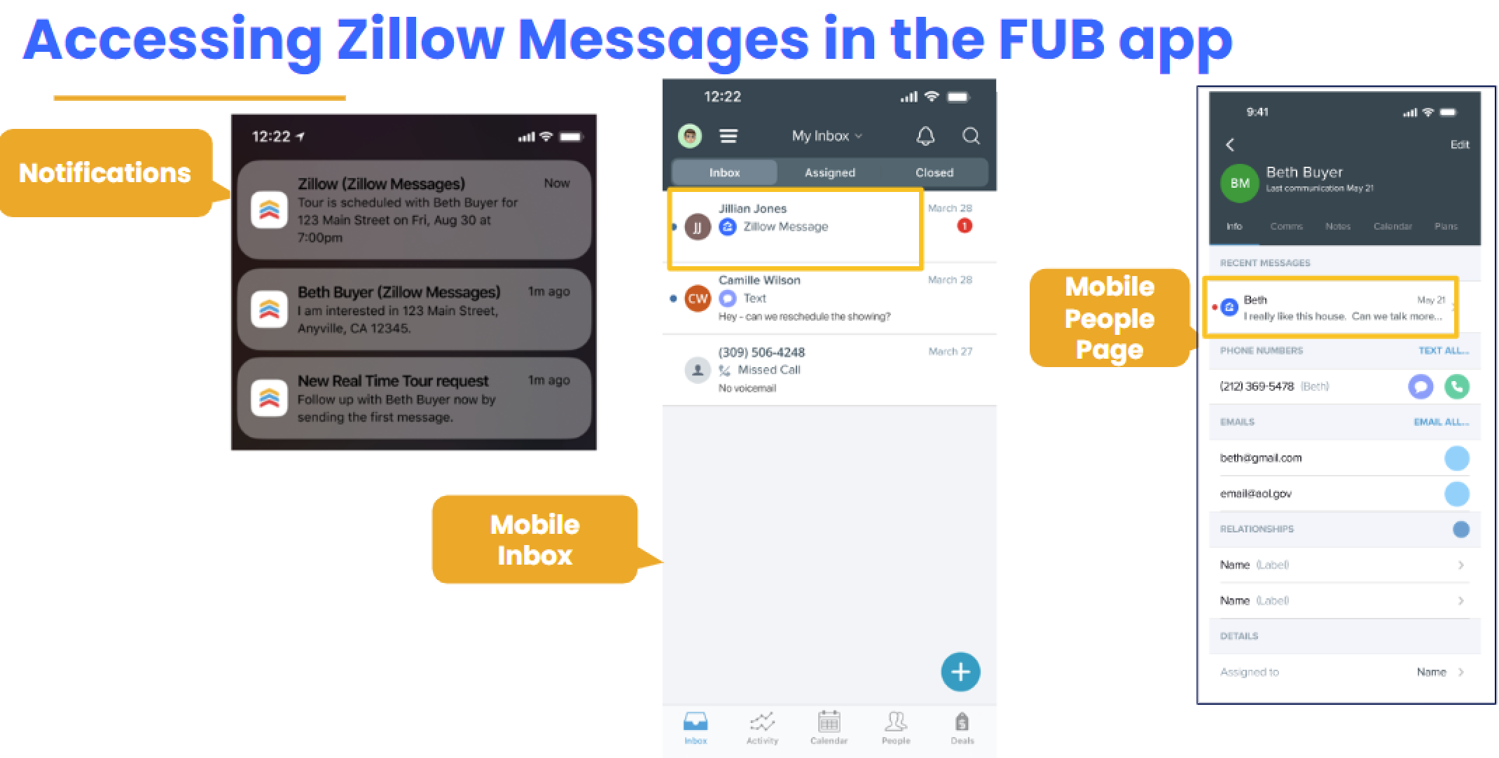 Zillow Messages in Follow Up Boss helps boost buyer engagement for Zillow leads. This is an “app-to-app” messaging platform that streamlines communications and is a foundational feature of the integrated transaction experience. When you send a Zillow Message in FUB, the buyer receives your message within their Zillow App, and they also get a text notification from Zillow with your message. They can reply to your message from Zillow or by replying directly to the text.