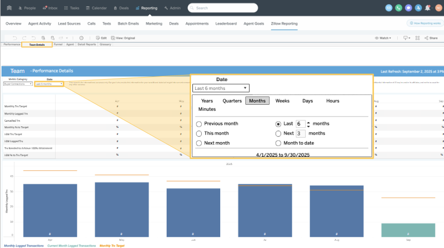 Zillow Flex team reporting can be viewed within FUB, providing real-time, actionable insights on team and agent performance. This report helps streamline performance management and accessibility.