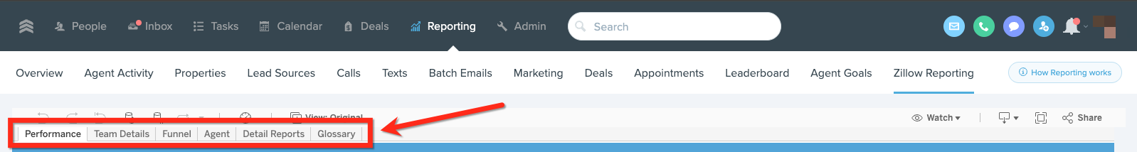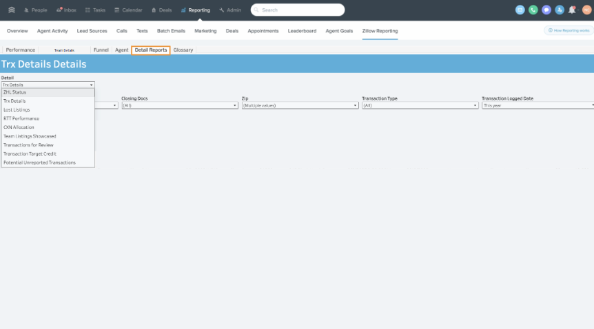 The Zillow Reporting on FUB organizes information into 5 tabs: Performance, Team Details, Funnel, Agent, and Detailed Reports.
