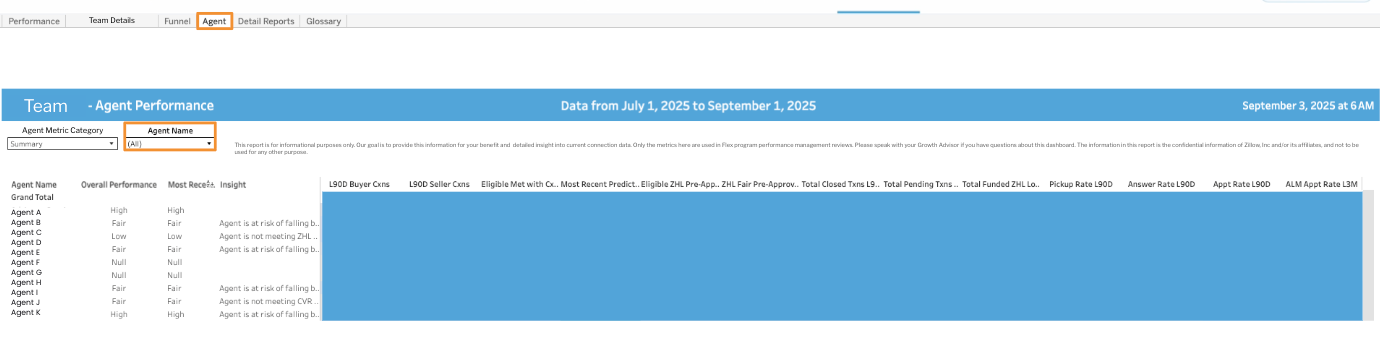 The Agent Report focuses on one agent, which allows you to focus on coaching opportunities for that specific agent and gives a detailed breakdown of the agent's Flex performance and how they compare to other agents.