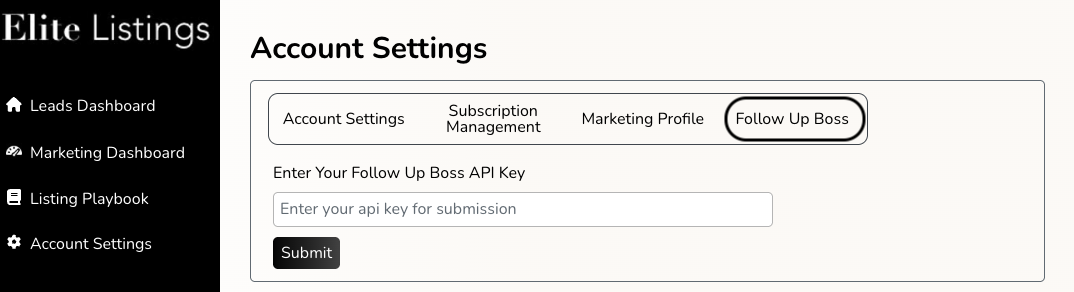 7. Select Follow Up Boss and paste the FUB API Key (copied in step 4). Click Submit and then confirm the API information is correct.