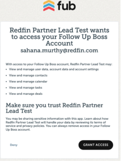8. Read the notice from Follow Up Boss. Complete the integration by clicking Grant Access to enable Redfin to access your Follow Up Boss account.