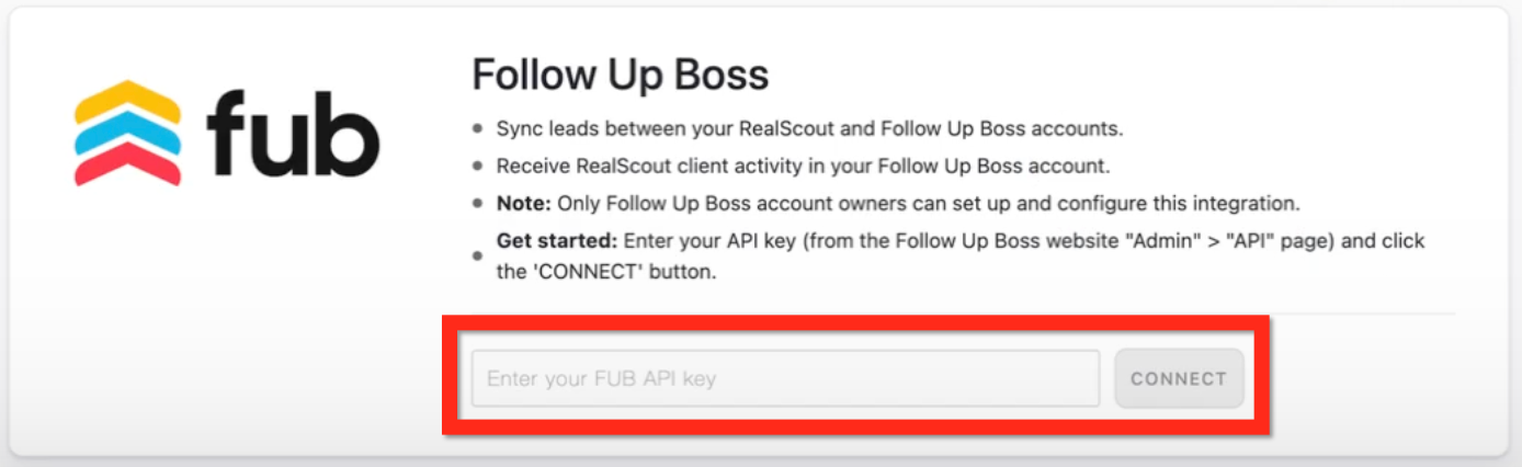 Note: The RealScout API integration must be completed by the account owner. If a team member on the FUB account has their own Realscout account that's not part of the FUB account owner's Realscout account, email support@realscout.com to request that they link the FUB team members' Realscout account to the FUB Owner's RealScout account from the back end.