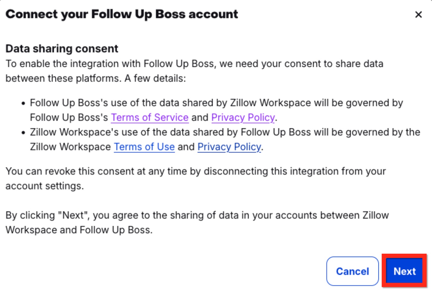 Accept the data-sharing consent to share data between Follow Up Boss and Zillow Workspace.