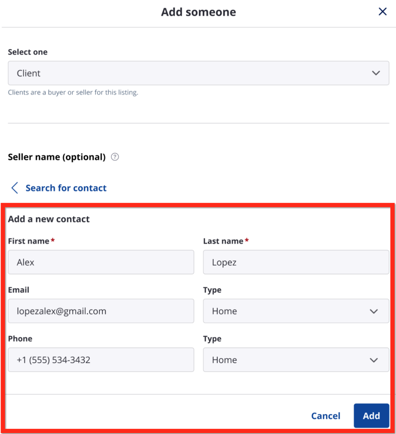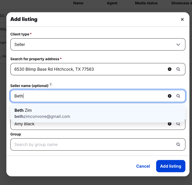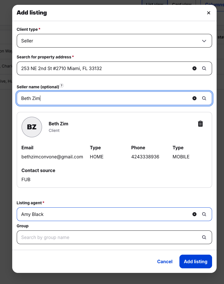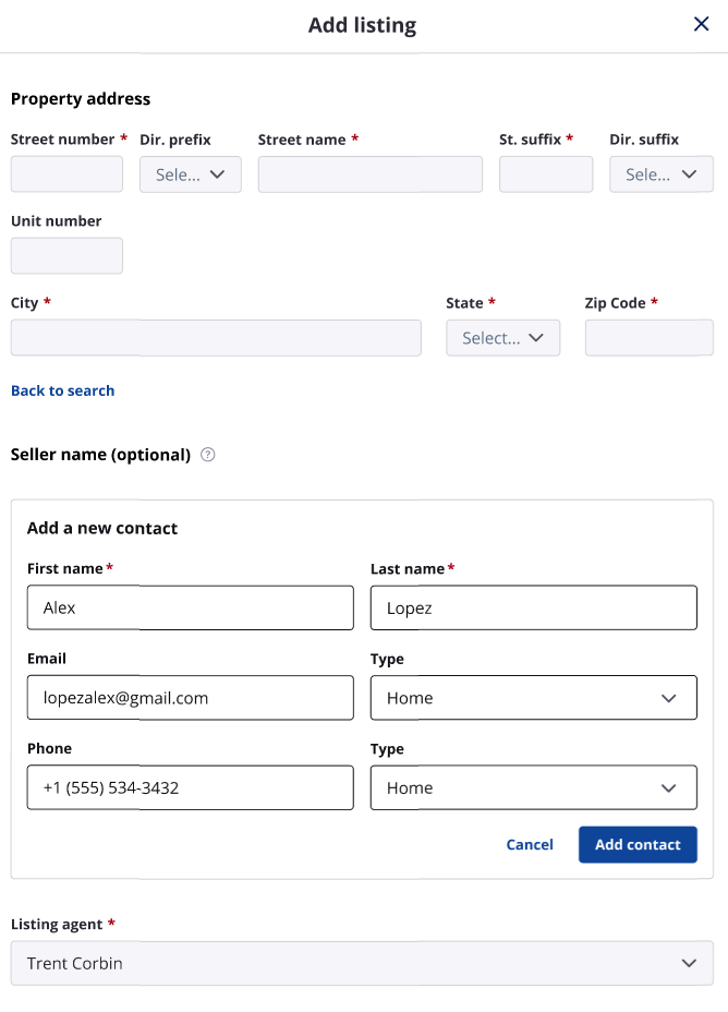 After selecting a matched contact or adding manually, the contact will be added when the listing is created.