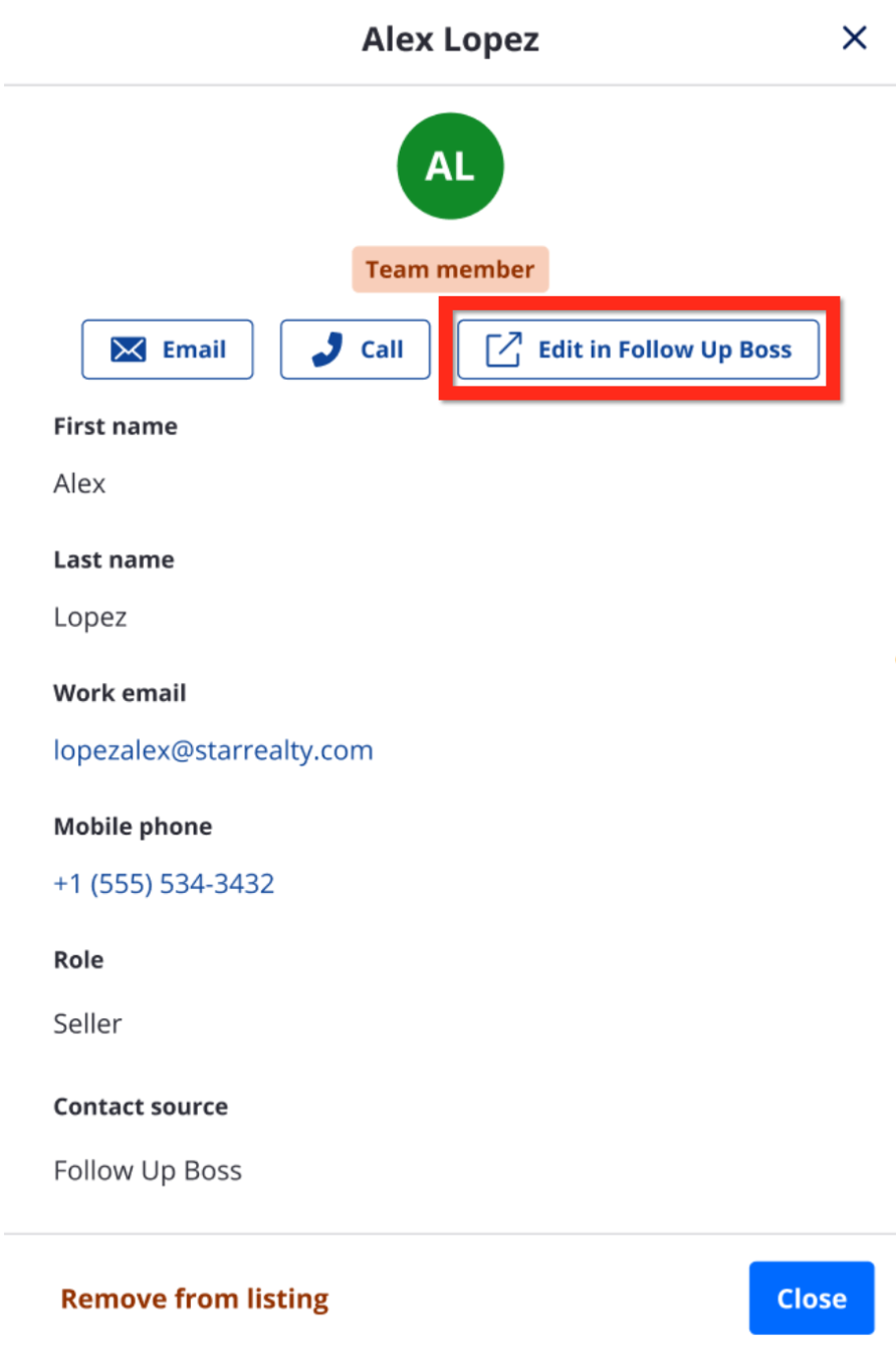 - To edit a FUB-synced contact, use the link to redirect to FUB and update the contact. Those updates will flow back to Zillow Workspace.