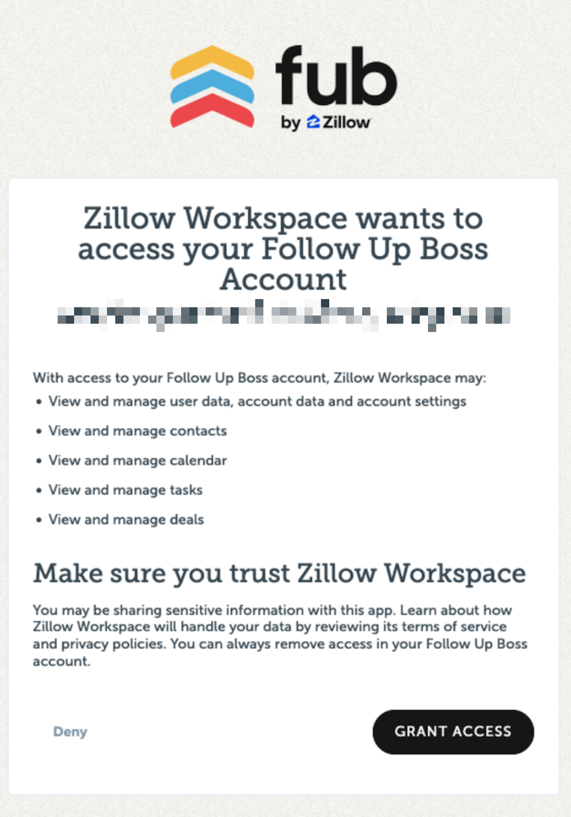 Grant Zillow Workspace access to FUB data.
