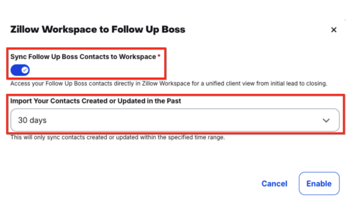 You can also perform a one-time import of existing contacts from your FUB account into Zillow Workspace. This import lets you pull in contacts created or updated within a selected timeframe—from the past 30 days up to the past 2 years. New contacts created in FUB will continue to sync automatically going forward.