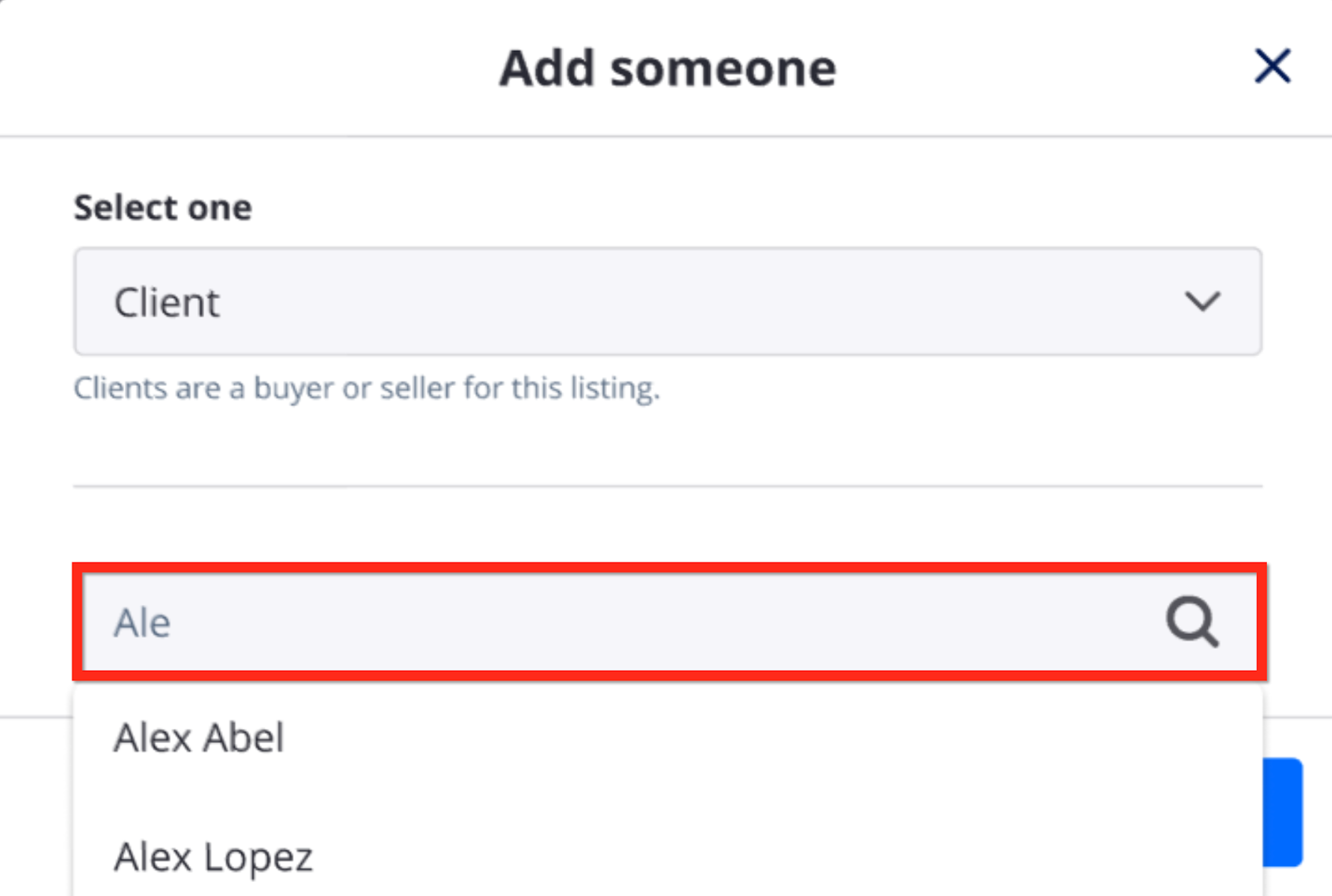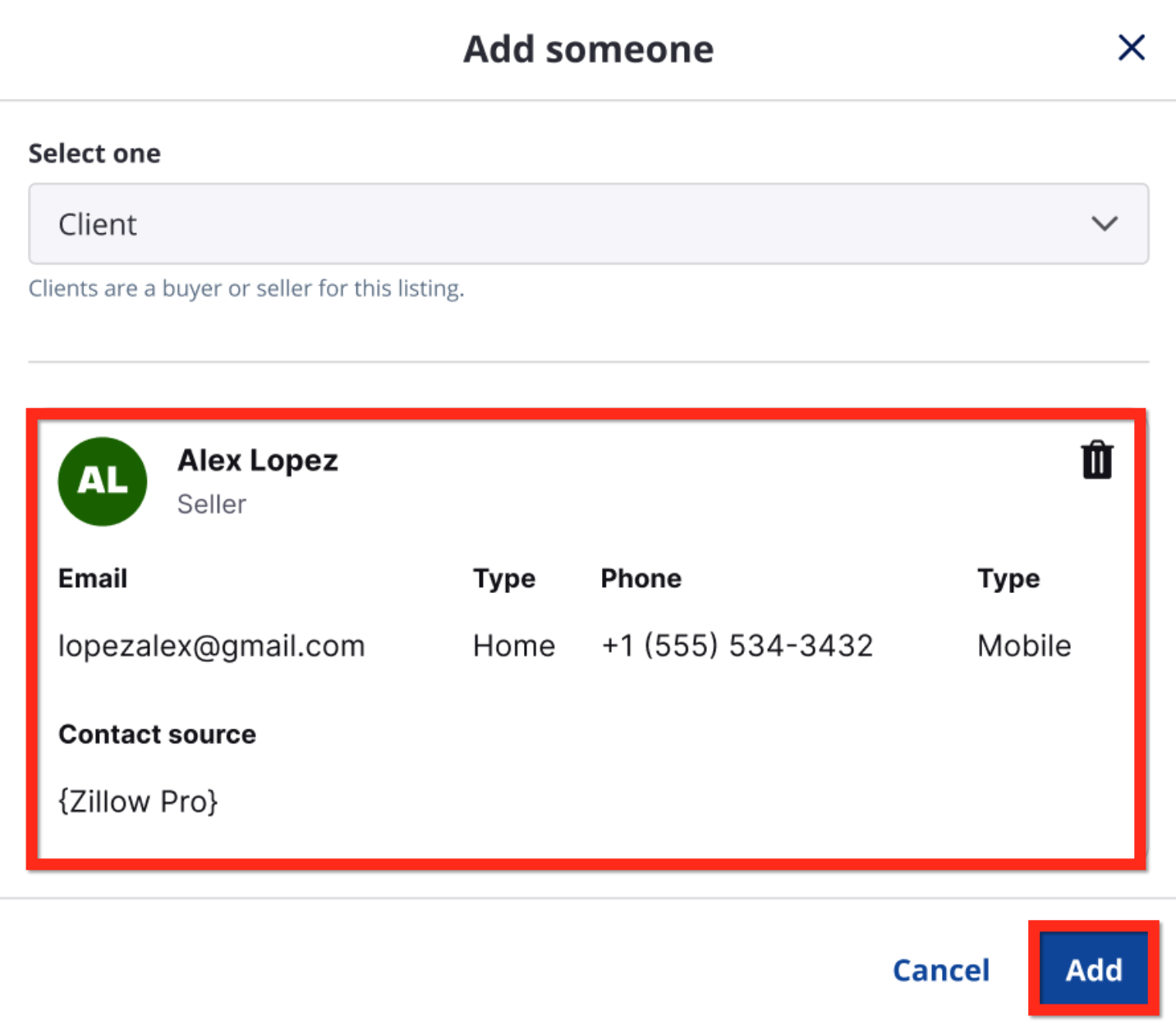 If a match is selected, the agent will be able to view a summary of the contact before adding it to the listing.