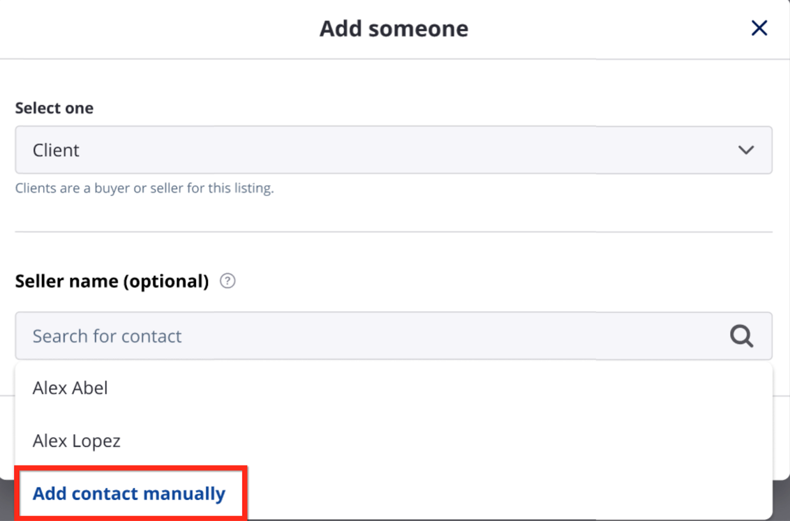 A manually created contact will be added to the agent’s rolodex and can be added to additional listings.