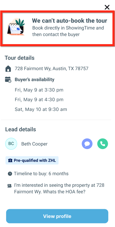 - The agent will be directed to book the tour directly in ShowingTime by displaying buyer availability.
