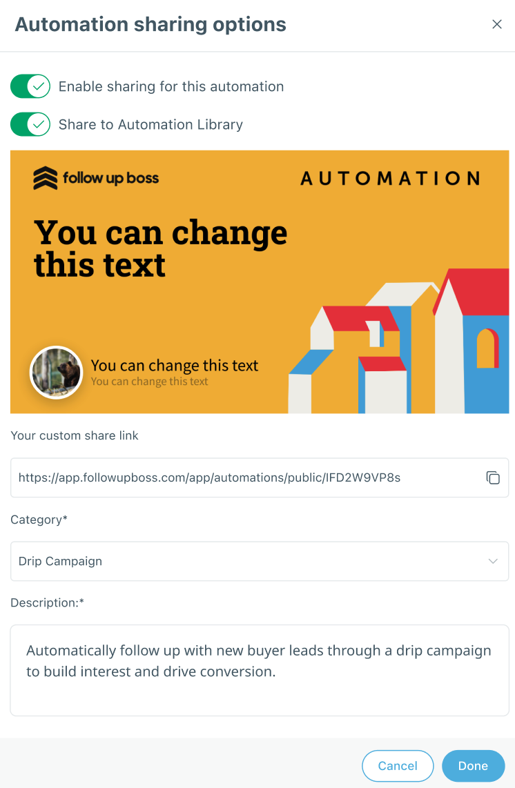 When you share to the library, your automation becomes publicly discoverable by all FUB users in the Community section.