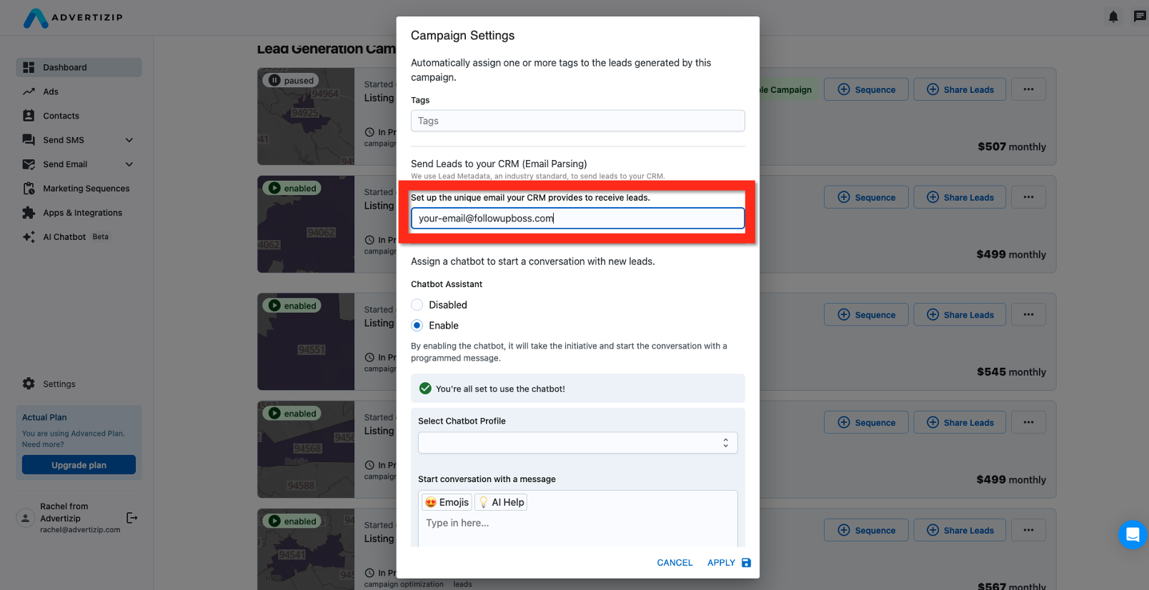 Add your Follow Up Boss email dedicated to email parsing in the “Send Leads to your CRM (Email Parsing)” section/input.