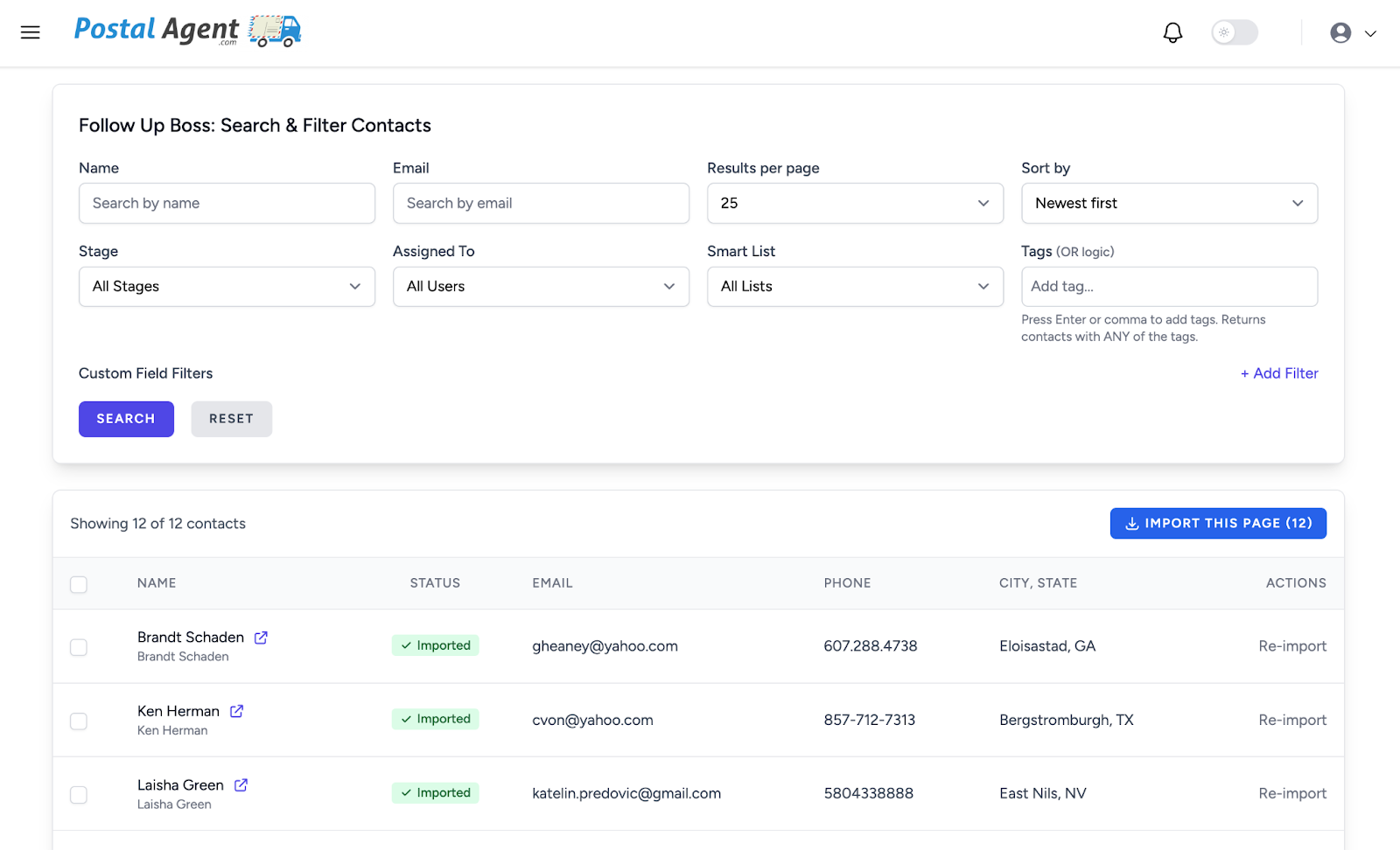 Once connected, you can browse your Follow Up Boss contacts directly within PostalAgent. Search or filter to find the contacts you want, select them, and import them into a PostalAgent mailing list.