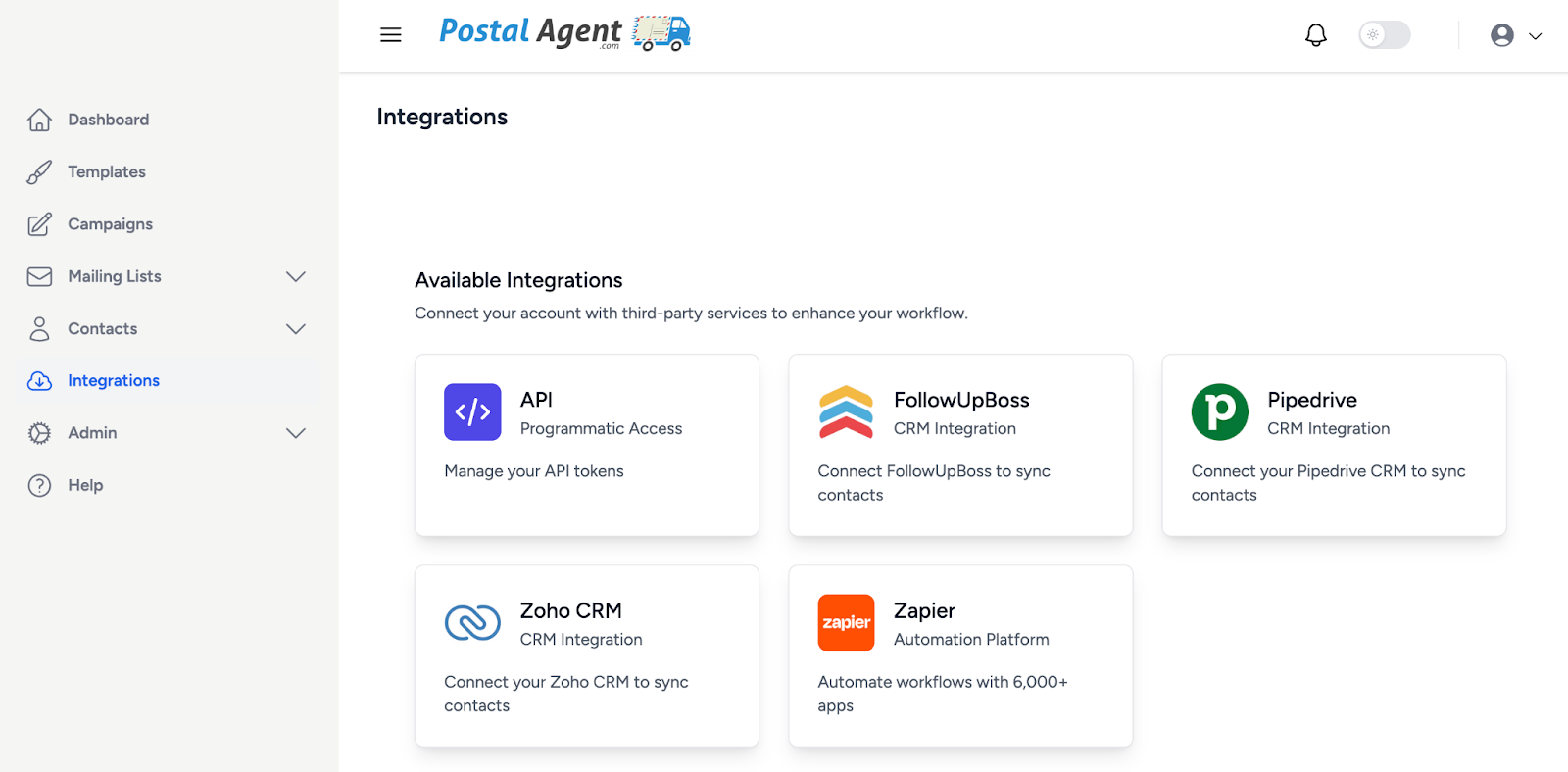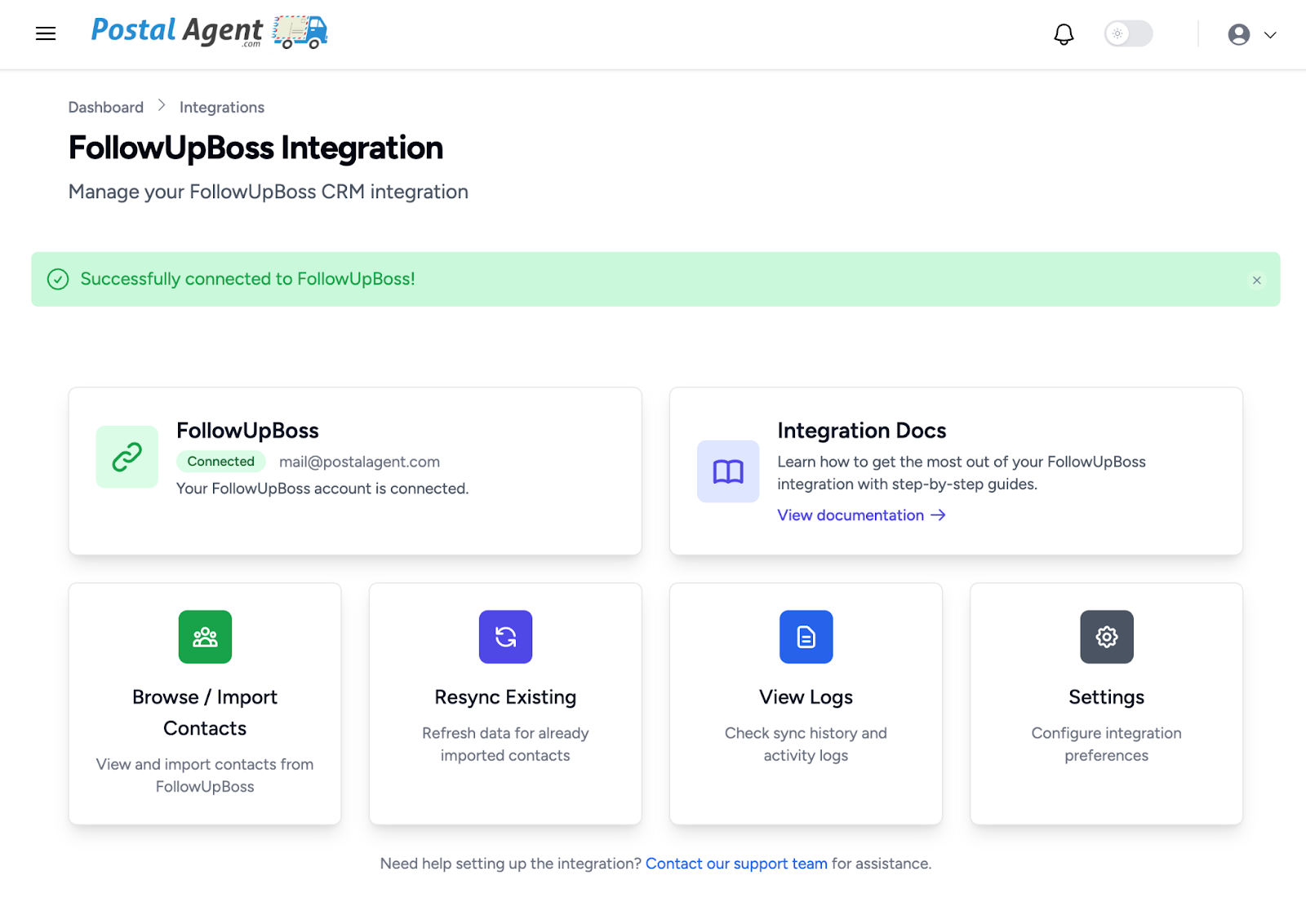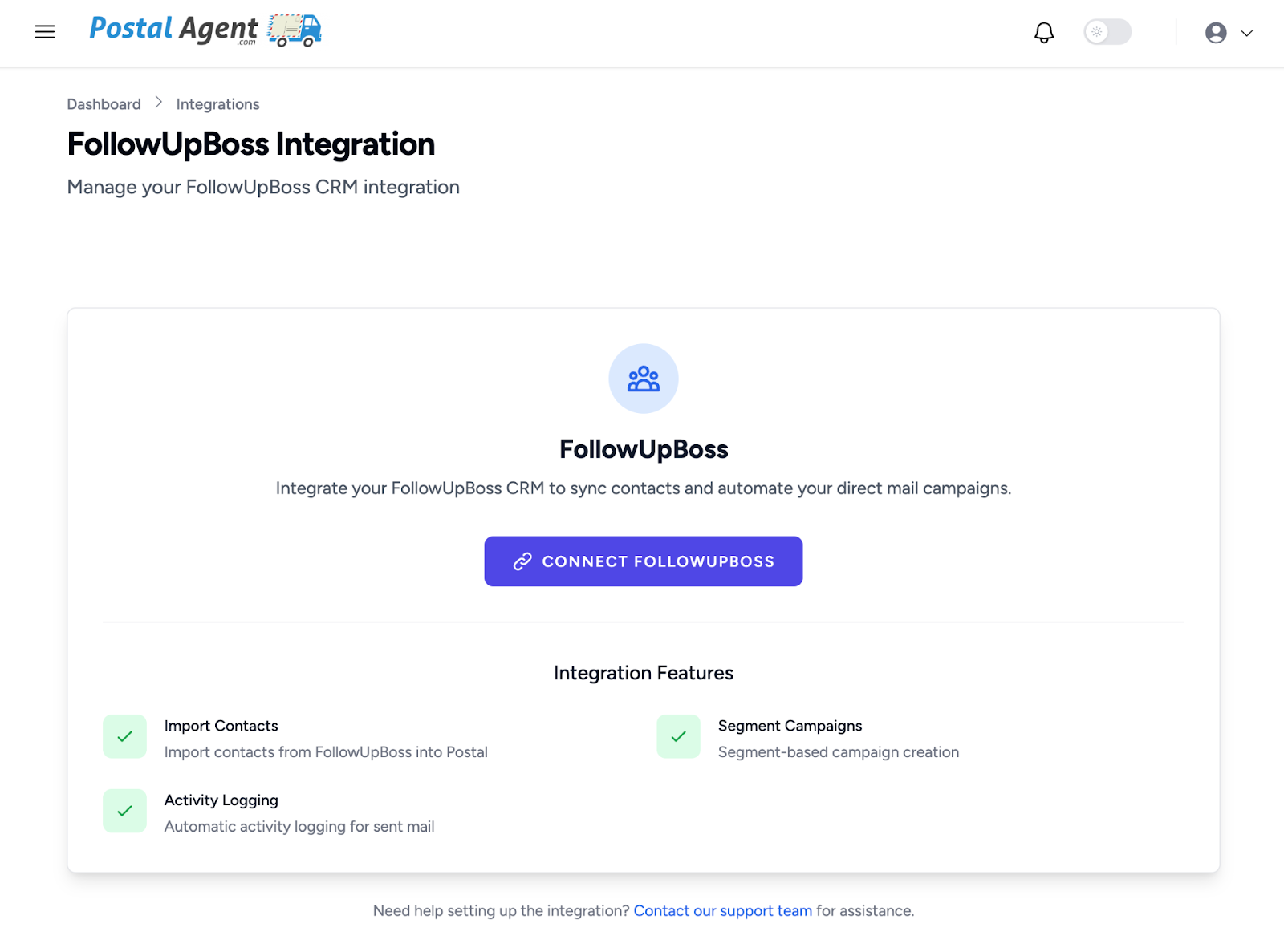- In PostalAgent, go to Integrations, then select Follow Up Boss.