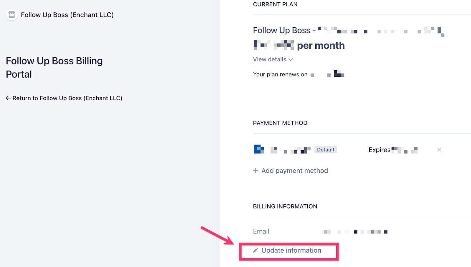 Owners can manage their plan, users, billing, and business information within their Follow Up Boss Account. Billing management can be accessed by going to Admin > Billing.