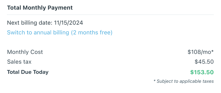 The total monthly payment section shows the next billing date and provides the option to switch to annual billing (if you are on a monthly subscription). It also shows the monthly cost, sales tax, and the total amount due.