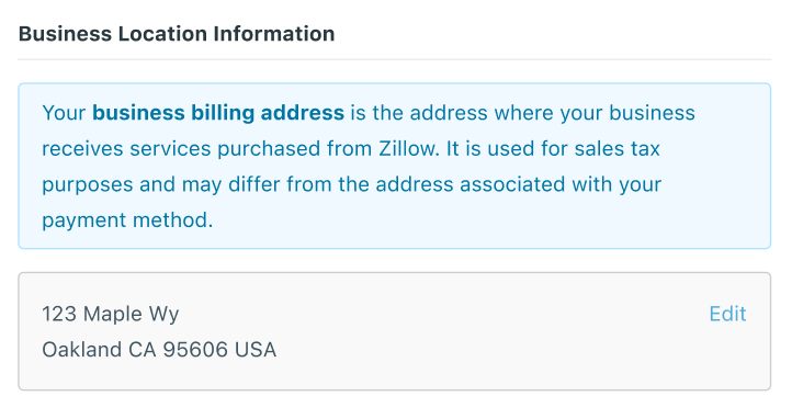 The business location information determines your sales tax rate, where applicable, and will appear on your invoices. To learn more, check out Business Billing Address.