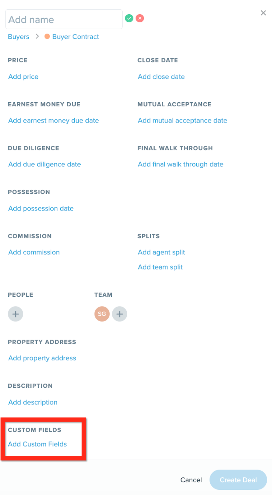 1. The owner of the account can create custom fields for deals by going to Deals > Settings > +Add Custom Field