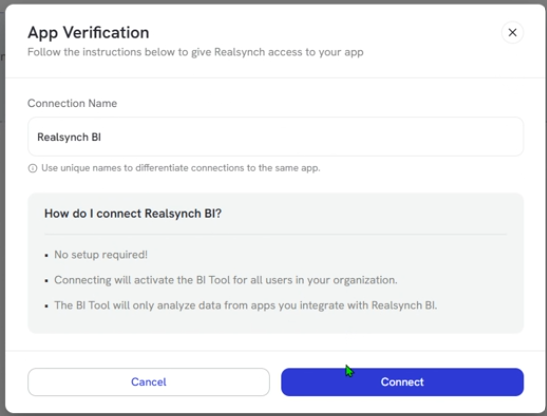 Please Note: the Realsynch BI App does not require any setup! Just click Connect and you’re ready to connect via integration.