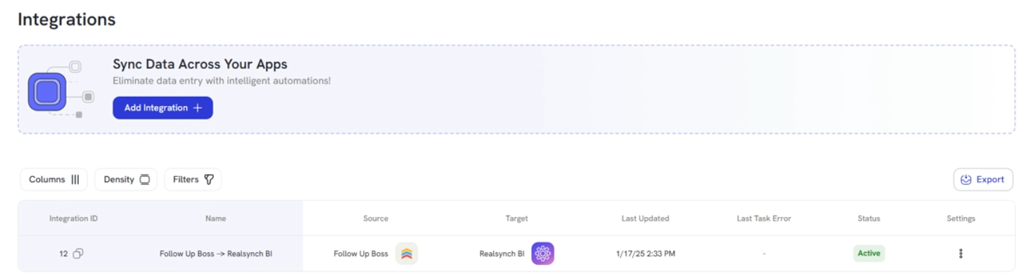 RealSynch pulls information from multiple sources within the Follow Up Boss, such as the Appointment Feature, Deal Pipeline, and Lead Information, to provide the best insights possible from the information provided. RealSynch also allow customization of the integration to ensure they are pulling the right data based on how Follow Up Boss is used.